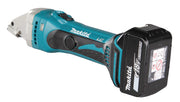 Eine Akku-Blechschere für gerade und kurvenförmige Schnitte mit einem Schnittradius von 30 mm, schneidet einen sauberkantigen Streifen von der Mitte aus. Doppelschnitt-Mechanismus: verhindert die Verformung des Bleches. Anti-Restart Funktion mit LED-Kontrolle. Schnittleistung 2.5 mm für Aluminium und 1.0 mm für Stahl. Das Gerät hat eine Hubzahl von 4'300. Geliefert mit 2 x 5.0 Ah Akkus, Schnellladegerät, Schneidmesser (eingebaut), Schlüssel, Makpac-B Transportkoffer.