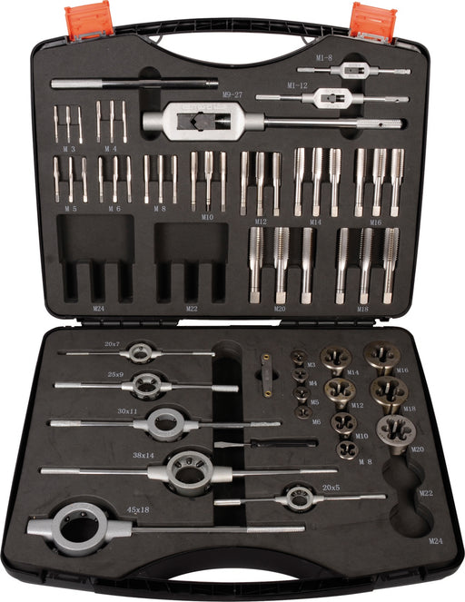 PROJAHNGewinde Schneidzeug Satz HSS-G 51tlg M3-M12 1 Gewindeschablone (Art.-Nr. 915091) 1 Schraubendreher (Art.-Nr. 91508) 2 Werkzeughalter 2 Windeisen 21...