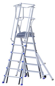 Plattformleiter mit Transportrollen, Geländer und Rundumschutz. Geriffelte Stufen 8cm für Sicheren Stand.