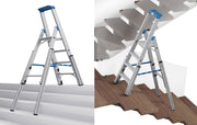 Vario-Teleskop-Stufenstehleiter mit Bügel und Ablagefach. Stufentiefe 8 Cm.